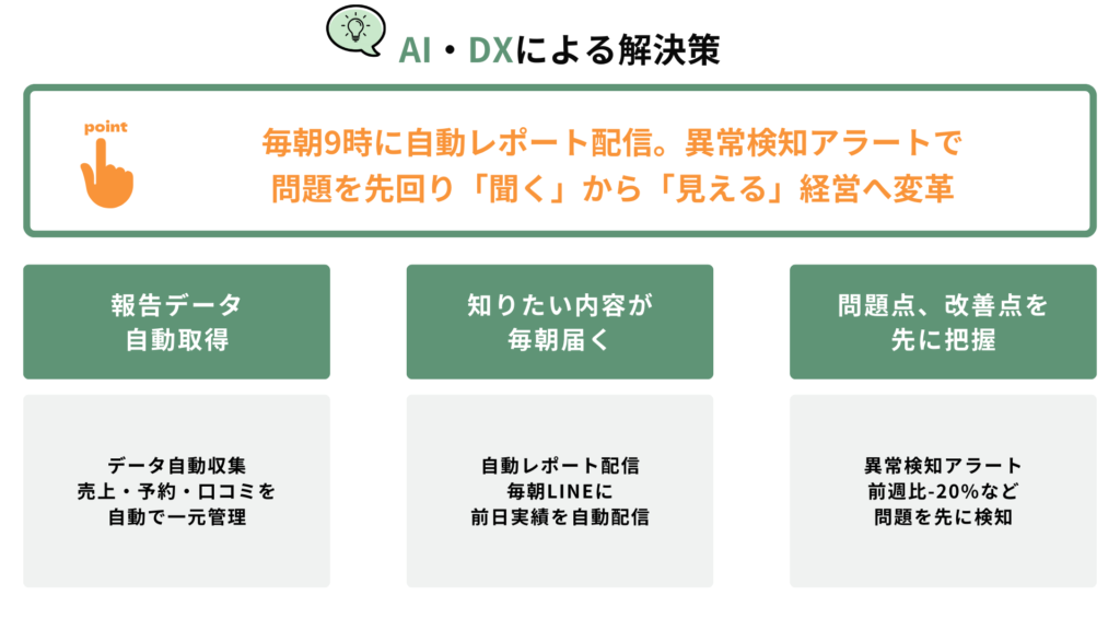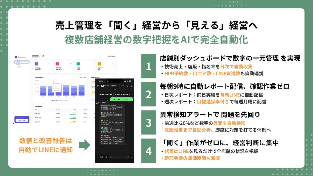 | 売上把握 | スタッフに都度確認 | 毎朝9時に自動配信 | 確認作業ゼロ |