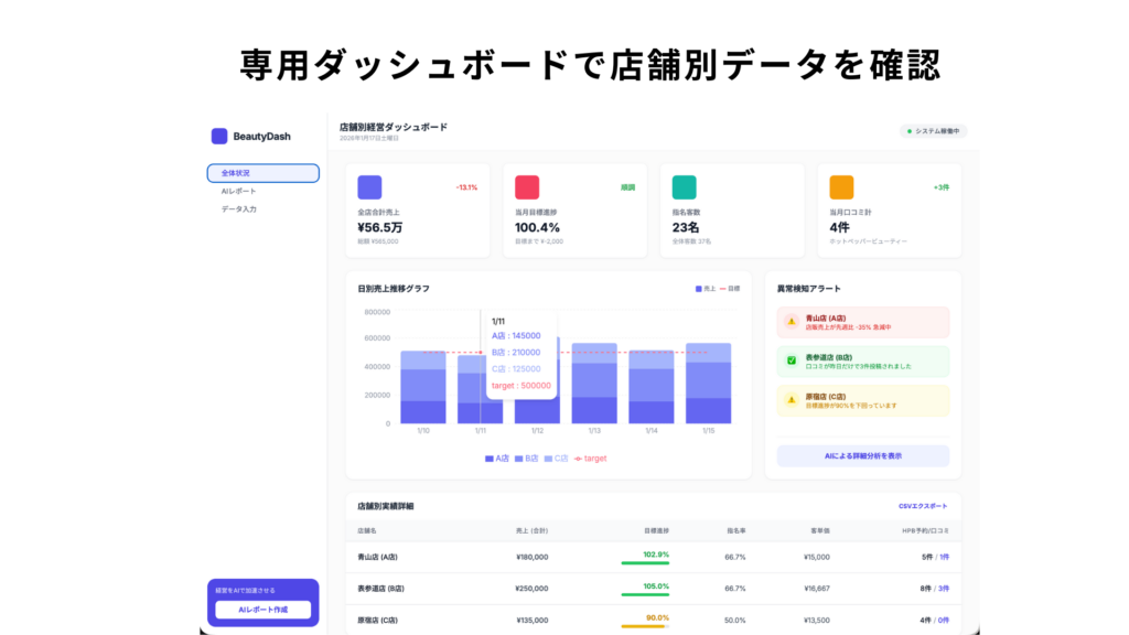 - 各店舗の数字が1つのダッシュボードに集約