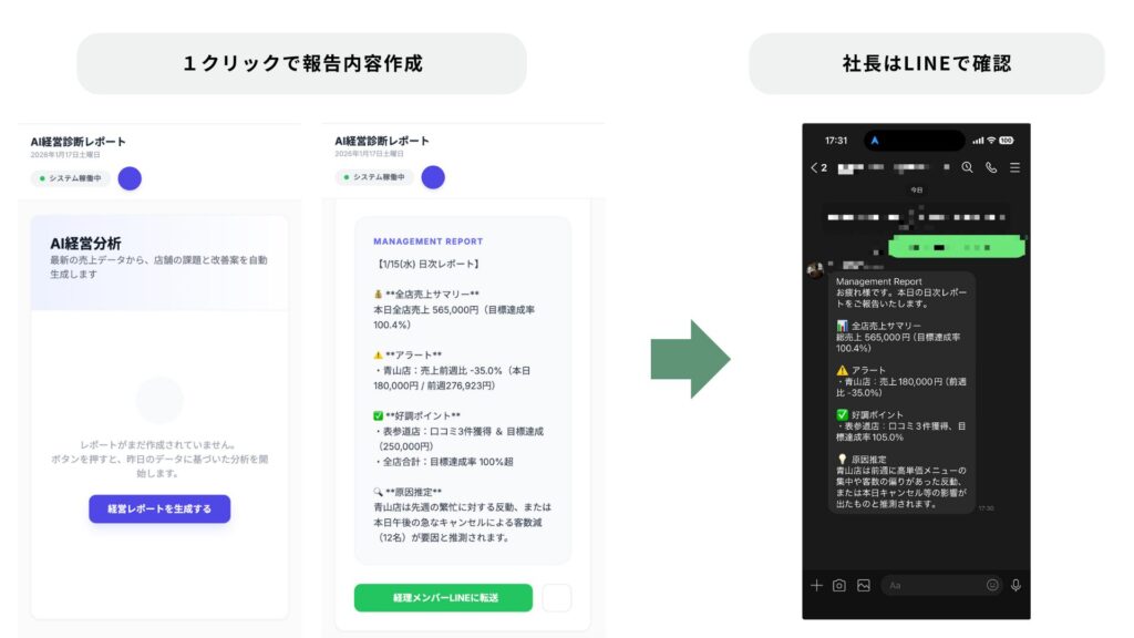 - 日次レポート:前日の全店売上・目標比・トピックスを配信