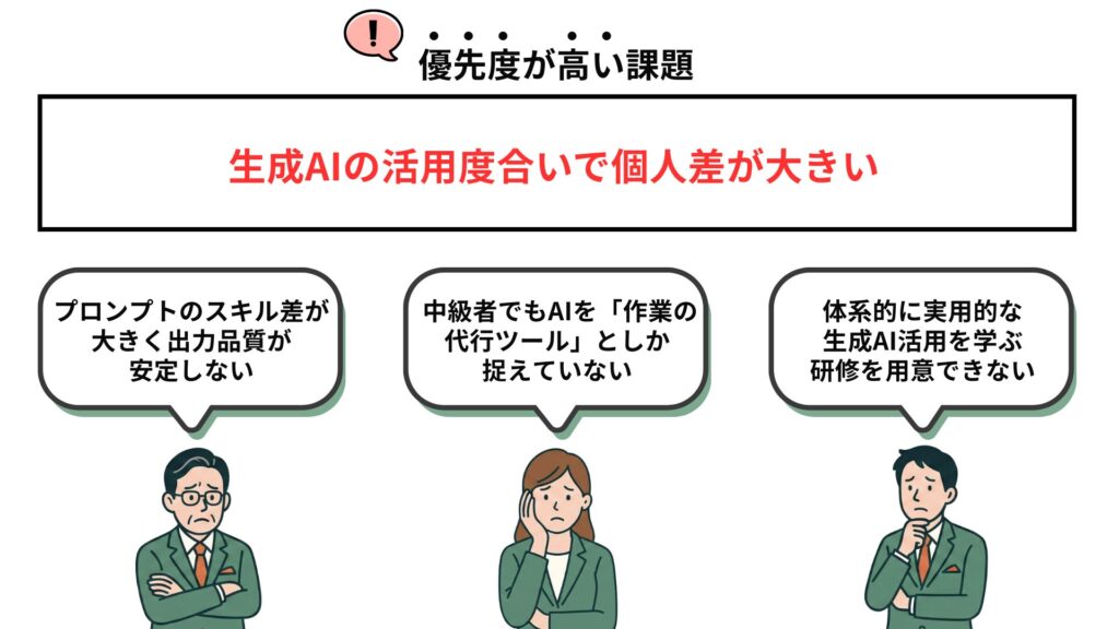 | プロンプトスキル | 統一指針なし・属人化 | レベル別の型を全社で共有 |