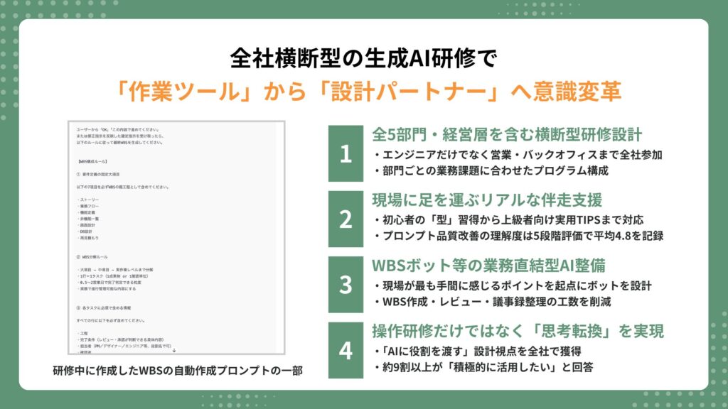 理論先行ではなく、WBS作成や議事録整理など、メンバーが日常的に時間を取られている業務を起点にAI活用を設計する姿勢が信頼につながりました。