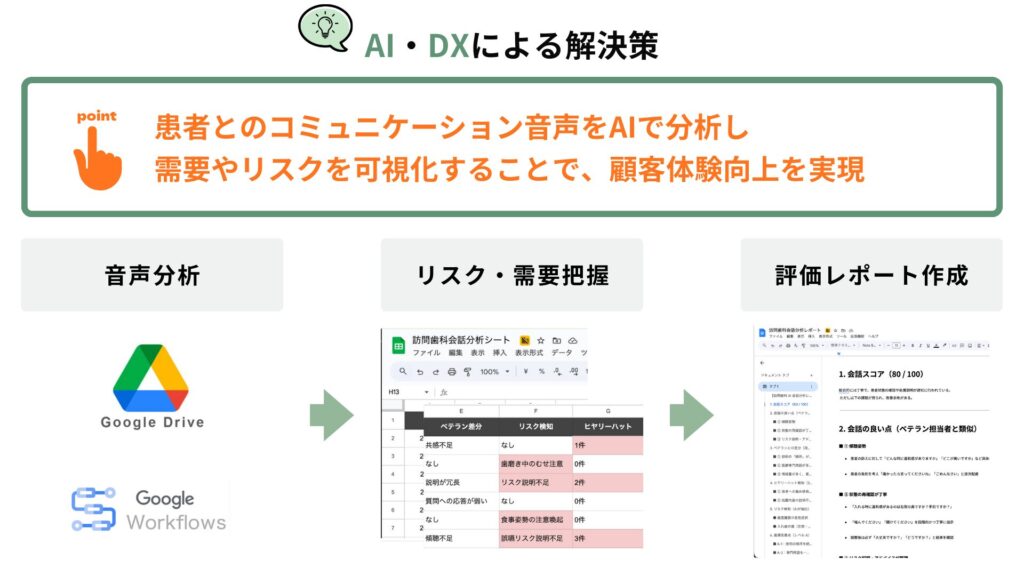 こうした課題を抱える訪問歯科事業者が、AIを活用してベテランの会話技術を自動継承し、新人教育を効率化した事例をご紹介します。
