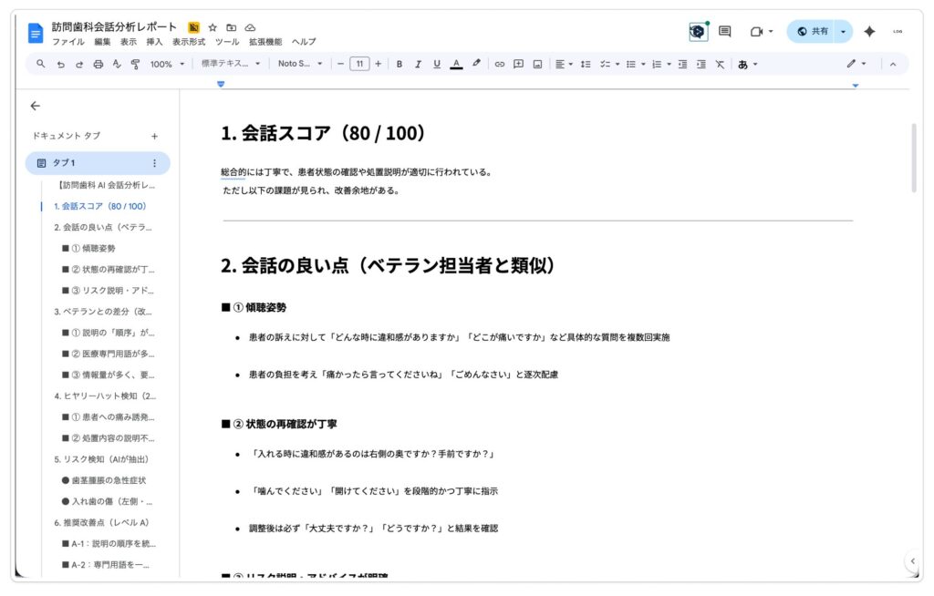音声をアップロードすると、AIが以下のレポートを自動生成: